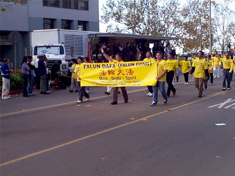 周六上午,学员们和其他游行队伍聚集在郡政府大院一同等候出发。 部分学员利用这段时间席地打坐,这吸引了挨着我们队伍的女童子军围观,看到众多的孩子们观察的那么专注,几个学员就坐下来教她们第五套功法。令人感动的是她们每个人都学得非常认真。这时领队的则跑了过来索取资料,表示会与学员联系将来学功的事宜。上午11点,游行准时开始。开头是举着牌子的童子军,每块牌子分别标出了美国参加过的历次战争的伤亡失踪人数,然后是举着军旗的退伍军人。跟着的队伍里有参加过二战、韩战、越战等的退伍老兵和被俘军人,有各当地驻军的仪仗队,有高中军训营的学生,有高中的军乐队,最后是法轮功的队伍。法轮功的队伍以中英文蓝底黄字的法轮功横幅为先导,六名小学员紧随其后,身着黄T恤衫的近五十名学员排成四路纵队在普渡济世的音乐声中行进,受到了路边观众的热烈欢迎,人们不断地向我们挥手,欢呼,大家也向观看的行人微笑挥手致意,形成了场内外融合一体的祥合场面。几名学员散在队伍两侧向观众分发报纸传单,很多人更是主动上前索取资料,最后当队伍经过检阅台前,主持人在扩声器中宣布:“现在走过来的是法轮大法的队伍,法轮大法是修炼身心的功法,遵循真善忍。”此时,周围响起了热烈的掌声。