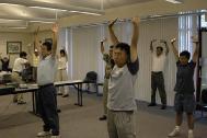 由于时间原因,我们移开部份椅子,只教了第一和第二套功法。有一些人离开了,但大多数人留下来参加炼功。我们一人教功,其他人在周围做个人辅导。在这期间,有一人突然大声并不规则地喘息,她出了问题。于是,一个学员沉着地扶她出去。一会儿,她又回来了,并说刚才的事与法轮功无关。情况还好。这些事是可以预料的,因为一些人是为了治病而来的。当然,我们都会根据法来处理这类问题。