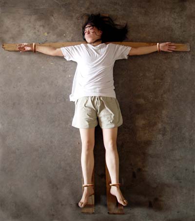 人的身体躺在狭窄的十字架上,把手和脚铐住后,人就在上面动不了。为了行恶,当人躺上去时,他们可以把十字架树起来,这样人就被悬空了,等于是吊在了十字架上了。有时,为了加剧行恶,他们还让恶人把十字架斜着放,并故意用力摇晃十字架,加重痛苦的程度。