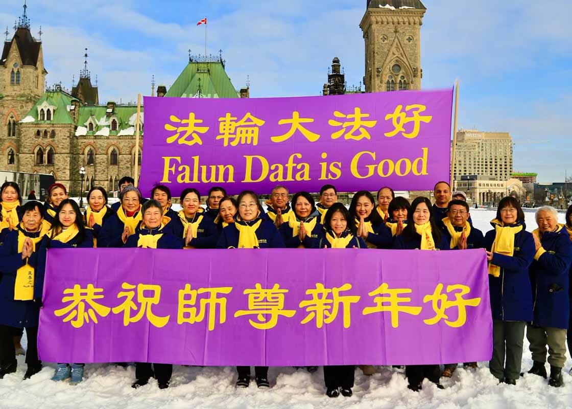 二零二五年新年之际,加拿大渥太华法轮功学员汇聚到国会山,以视频方式恭祝李洪志师父新年好。