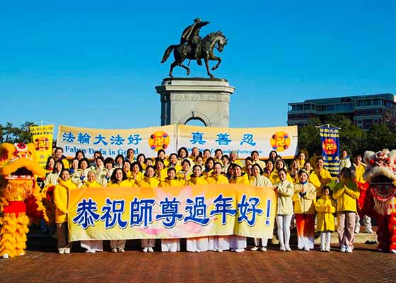 二零二五年一月十九日,美国德克萨斯州休斯顿的部分法轮功学员汇聚在市中心的赫曼公园,恭祝师尊李洪志先生过年好。