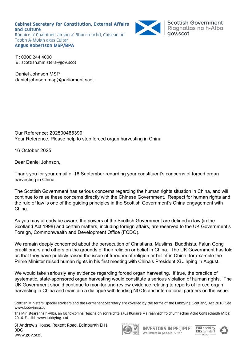 苏格兰政府负责宪法、对外事务及文化事务内阁大臣安格斯·罗伯逊(ANGUS ROBERSTON)在十月十六日回复苏格兰议会议员丹尼尔·约翰逊(Daniel Johnson)的信中表示:“苏格兰政府对中国的人权状况深表关切,并将继续直接向中国政府提出这些问题。尊重人权和法治是苏格兰政府与中国交往的指导原则之一。”