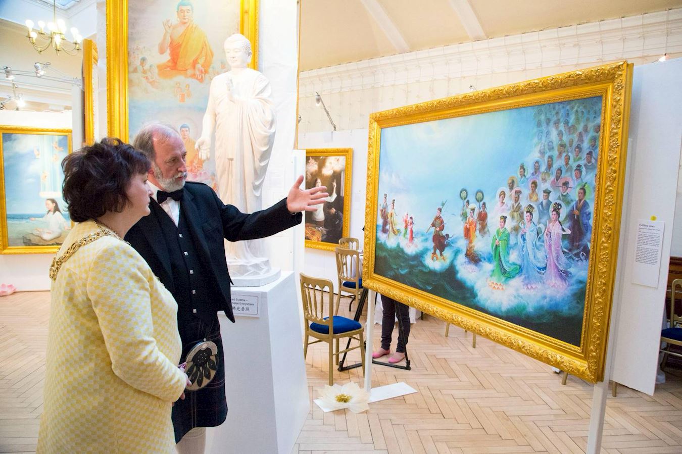 图3:2013年艾迪(右)向格拉斯哥市长介绍真善忍画展。