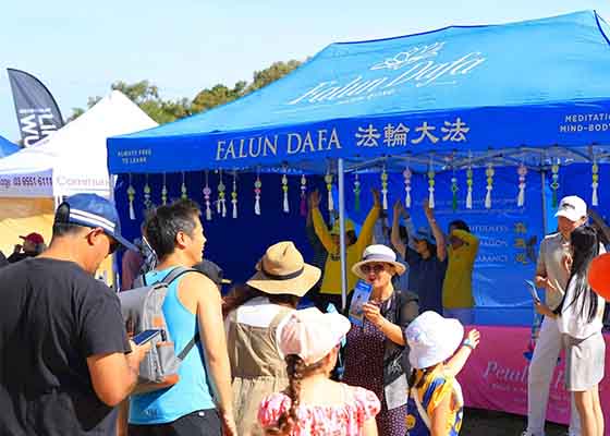 四月十三日,澳洲墨尔本举办了热闹的家庭派对,吸引了大量居民和游客。在欢乐的氛围中,在法轮大法展位上,学员们展示了祥和舒缓的五套功法,各族裔民众纷纷驻足,和法轮功学员交谈,并现场学炼功法。