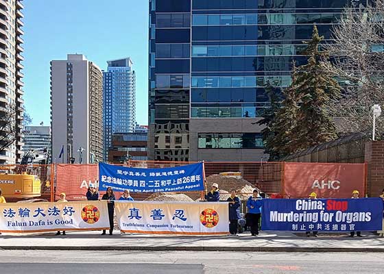 四月二十四日,加拿大卡尔加里部分法轮功学员在中领馆前举行集会,纪念四‧二五上访二十六周年。
