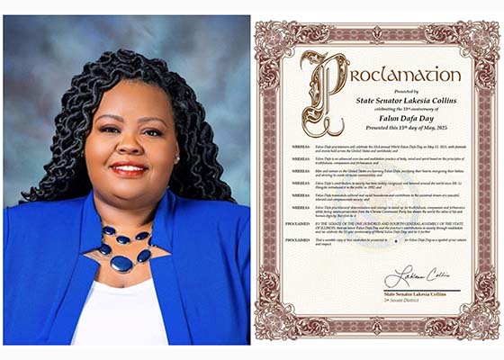 二零二五年五月,美国伊利诺伊州参议院通过了由参议员莱克西亚·柯林斯提出的庆祝法轮大法传世三十三周年的褒奖。