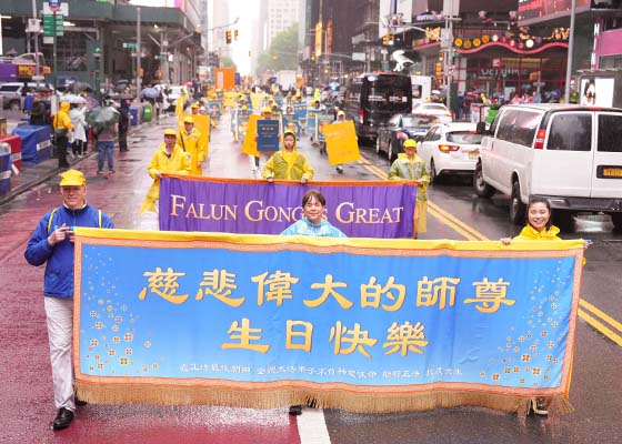 二零二五年五月九日星期五,在纽约的曼哈顿中城,数千名法轮功学员举行了盛大游行,庆祝世界法轮大法日。春雨连绵,滋润万物,各族裔法轮功学员冒着风雨,表达对真善忍的庆祝,对法轮大法创始人的感恩,与这个世界分享大法修炼的美好。