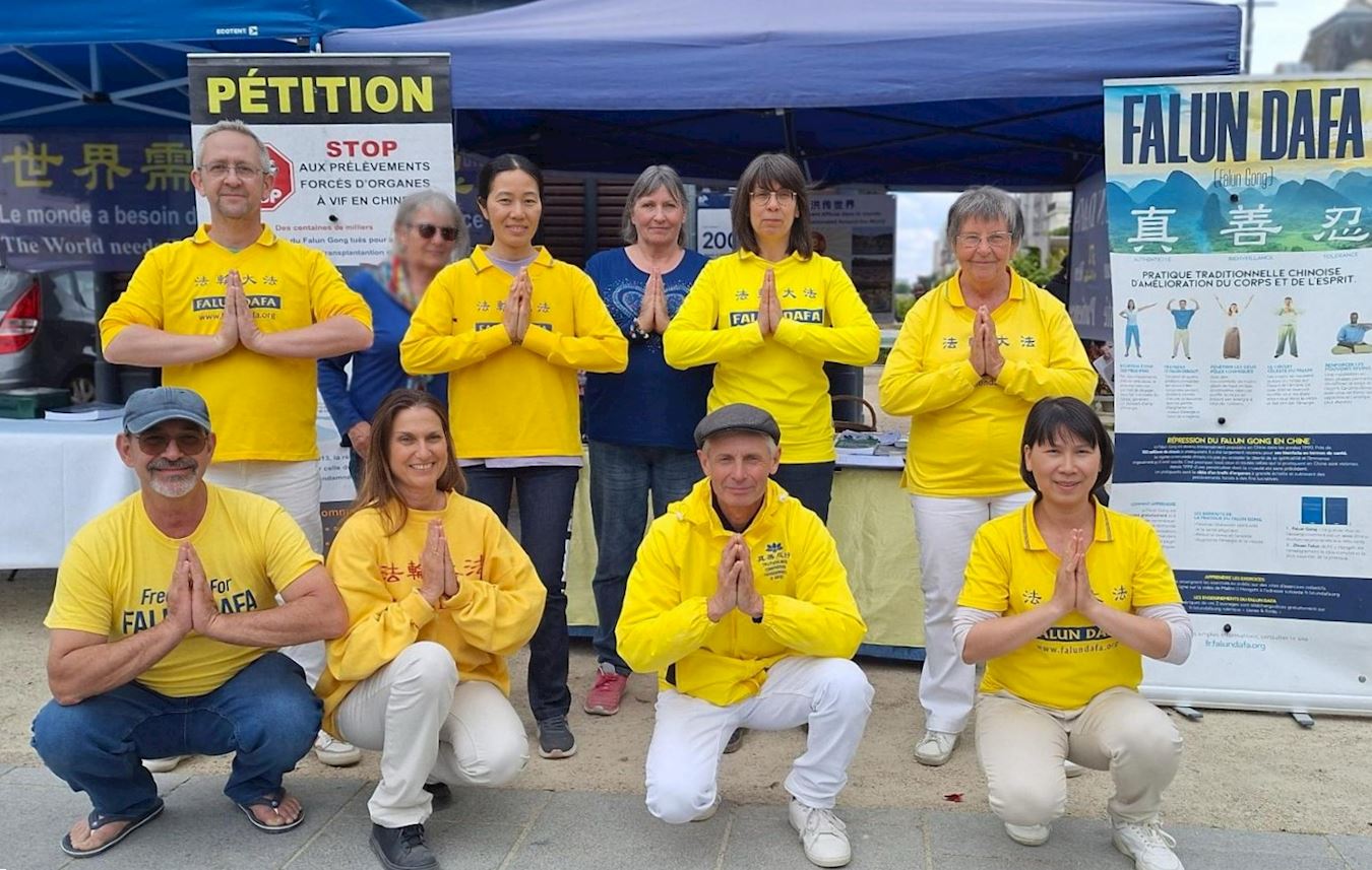 五月十日星期六,在法国雷恩市共和广场,来自法国西部的部份法轮功学员聚集在这里,庆祝法轮大法在全球弘传三十三周年。