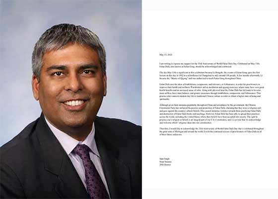 五月十三日,正当全球各地法轮功学员欢庆“世界法轮大法日”之际,美国密西根州第28选区州参议员萨姆·辛格发来正式信函,表达他对法轮大法的支持和认可。