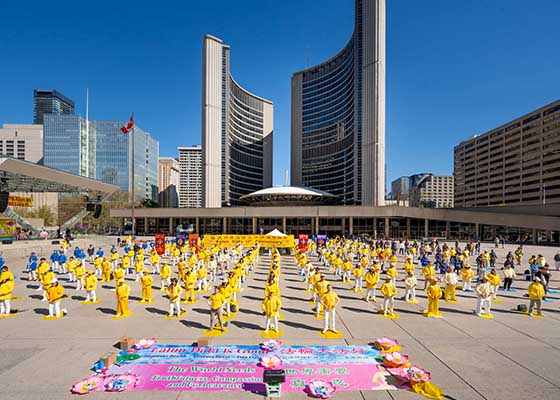 五月十一日,多伦多及周边地区的法轮功学员来到位于多伦多市政厅的弥敦菲利普广场,举办庆祝活动,迎接法轮大法弘传世界三十三周年。