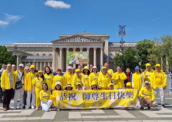 五月十日,匈牙利法轮功学员在布达佩斯的英雄广场举行活动,庆祝第26届世界法轮大法日暨大法创始人李洪志先生华诞。