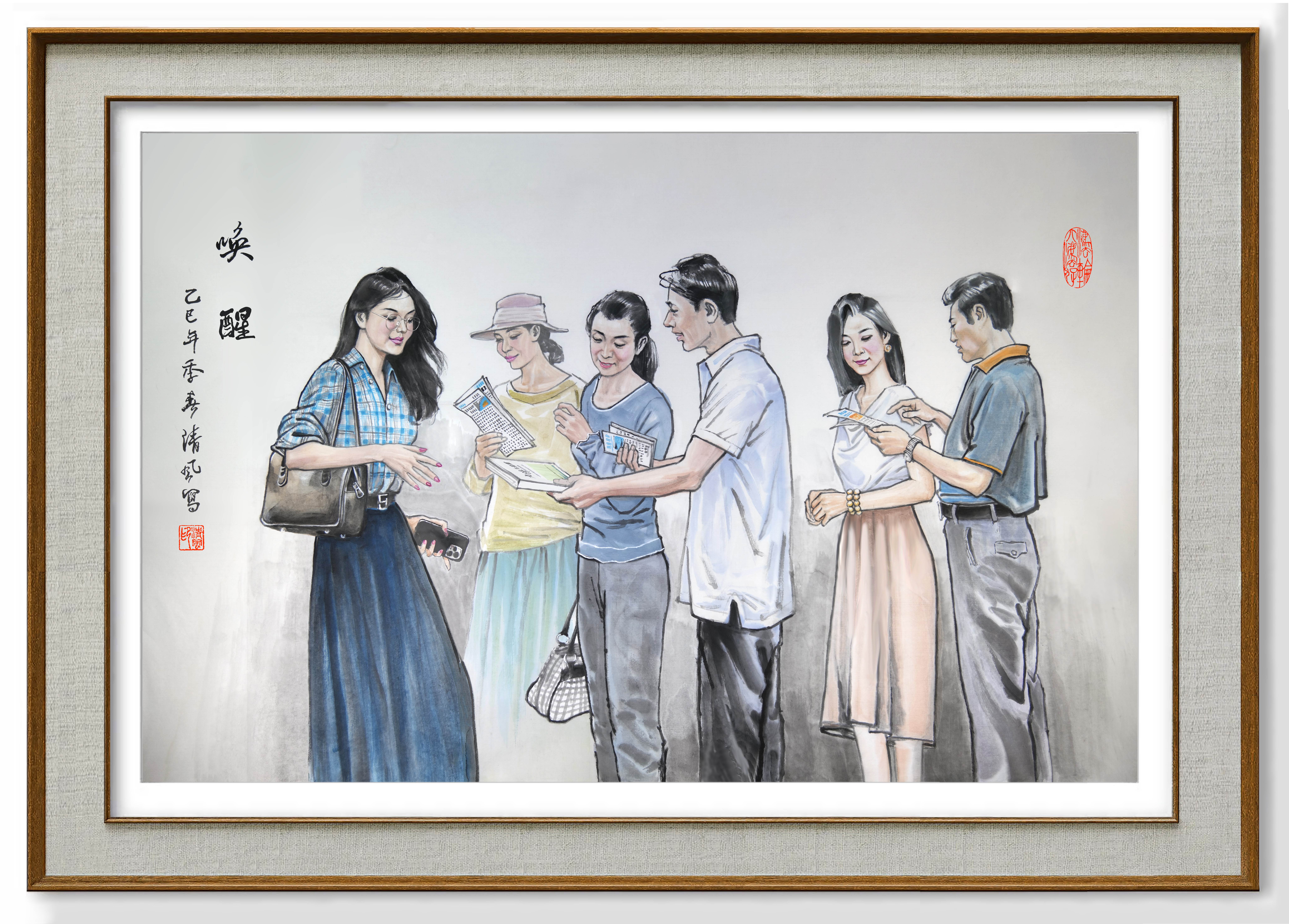 画意:大法弟子赠送《九评》、真相传单给世人,让人们了解真相,唤醒人们的善念。