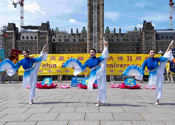 五月二十八日,加东部分法轮功学员汇聚在首都渥太华国会山前,庆祝法轮大法弘传三十三周年,十五位议员也来到国会山前同庆。