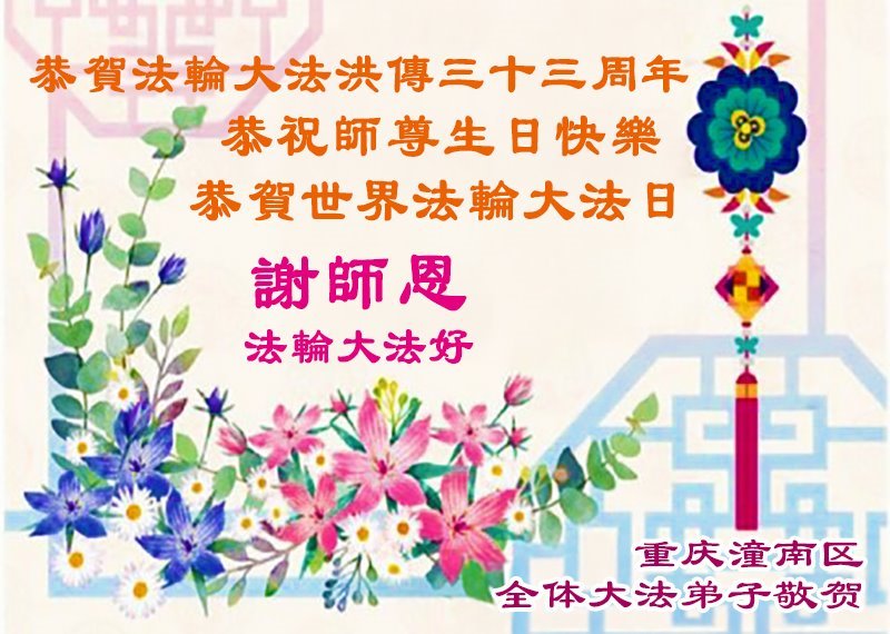 重庆市大法弟子敬贺世界法轮大法日暨师尊华诞!向慈悲伟大的师尊致以生日的问候!师尊辛苦了!感恩师尊慈悲救度和细心保护!
