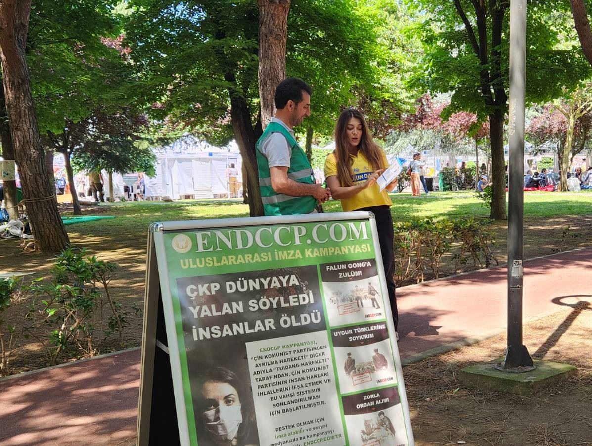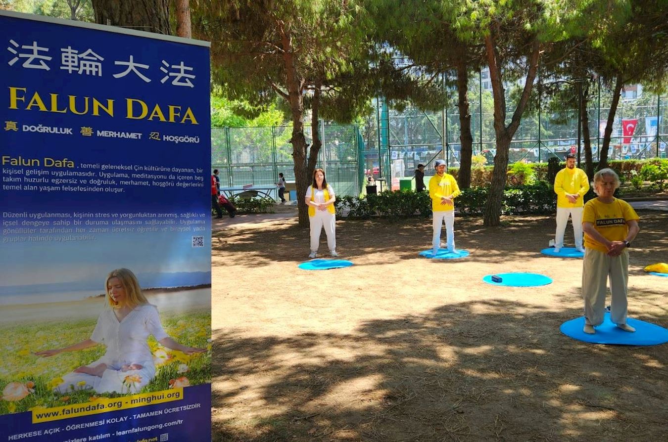 ![]() 图1:伊斯坦布尔的部分法轮功学员在环境节向人们展示法轮功功法 |