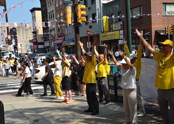 美国大费城地区部分法轮功学员6月28日在费城唐人街举行集会,通过集体炼功、征集签名、发放资料及演讲,向民众介绍法轮大法的美好。
