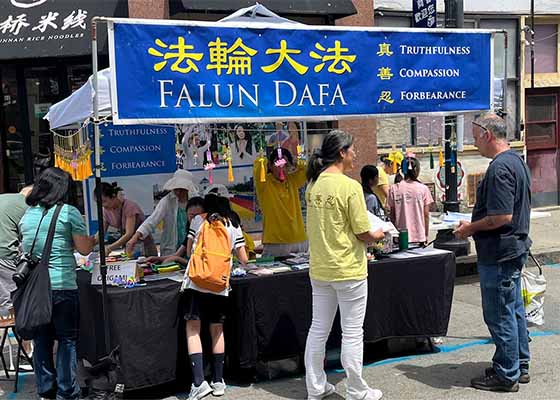 来自美国麻萨诸塞州的部分法轮功学员七月五日参加了位于波士顿中国城华埠主街的夏日节庆活动。他们设立展位,前来参观的民众络绎不绝。
