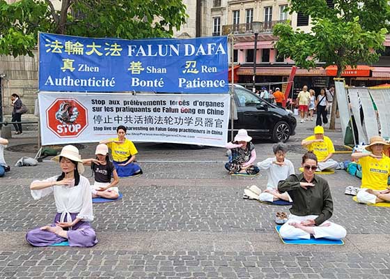 七月五日和十二日,连续两个周六下午,法轮功学员在法国巴黎市中心的夏特莱街区举办讲真相、炼功和征签活动,吸引许多人驻足观看。