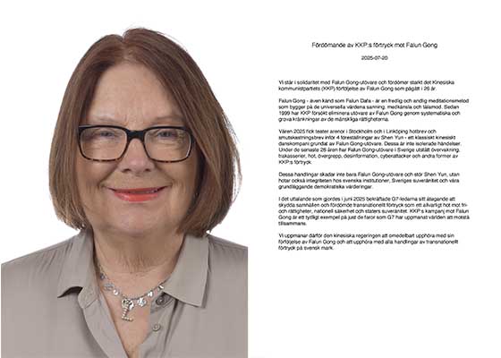 7月19日瑞典法轮功学员举行和平反迫害活动。瑞典国会议员洛塔・约翰森・福纳尔夫发来声明,强烈谴责中共对法轮功长达26年的迫害。