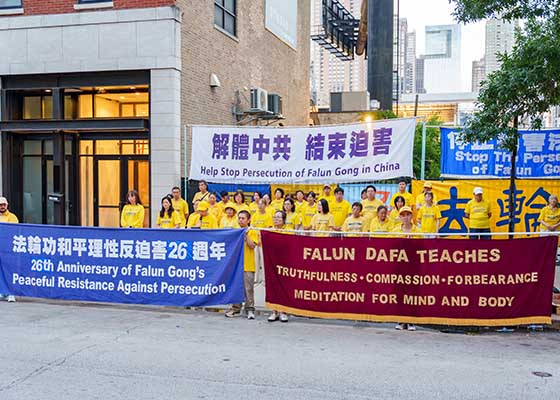 7月19日,大芝加哥地区法轮功学员在芝加哥中领馆前举行炼功、集会和烛光夜悼等活动,揭露和谴责中共对法轮功26年来的残酷迫害。