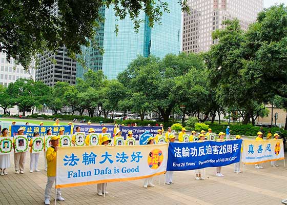 7月17日,美国德州休斯顿和奥斯汀的法轮功学员在休斯顿市政厅前的赫曼广场举行和平集会,要求中共立即停止迫害法轮功。