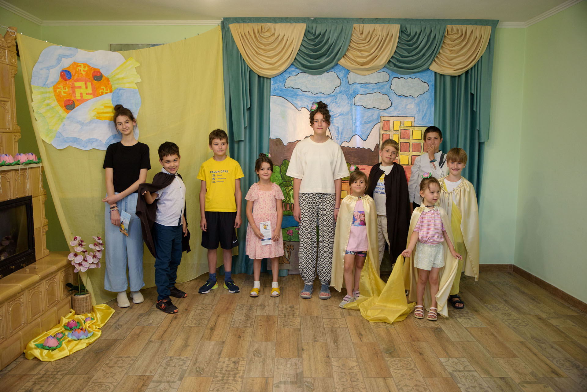 作为夏令营活动的节目之一,家长和孩子们共同排练并上演了一个短剧。孩子们自己构思角色、剧本和剧名《法轮大法能帮到你》,家长则负责布景。孩子们积极参与,主动承担责任,确保整场演出顺利流畅。
