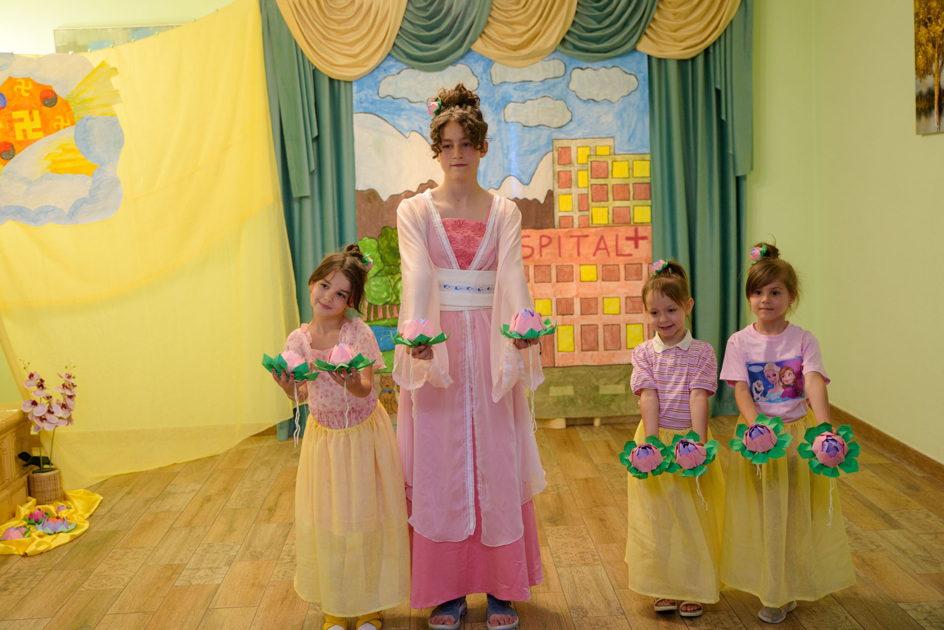 女孩子们表演的舞蹈《小莲花》,由两位有舞蹈经验的法轮功学员编排,灵感来自中国古典舞,基础技法。手工特制的裙子,孩子和家长还一起制作了纸莲花道具。