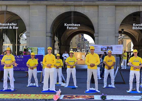 六月二十八日,瑞士法轮功学员再次来到首都市中心,展示法轮大法的美好并揭露中共非法关押、酷刑和活摘贩卖法轮功学员器官罪行。