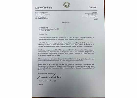 7月29日,美国印第安纳州参议员朗尼·M·兰道夫致函当地法轮功学员,表示完全支持当前以及未来所有呼吁停止中共对法轮功迫害的活动。
