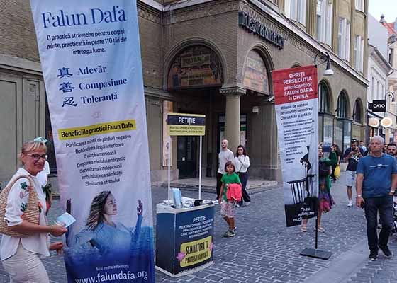 八月二日,罗马尼亚法轮功学员在布拉索夫老城中心举行了每周一次的法轮功信息日活动。