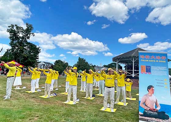 美国麻州“欢庆伯灵顿”活动 法轮功学员展示功法