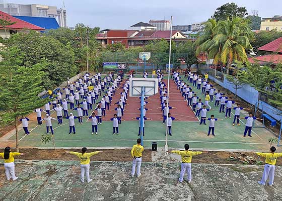 八月七日,印尼巴淡岛法轮功学员来到当地的卡蒂尼第二中学,向该校师生介绍法轮功及五套功法,受到大家的欢迎。校长向全校师生推荐法轮大法是让学生养成良好品格、身体健康的好功法。