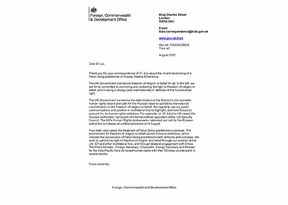 英国外交部8月15日回信英国法轮大法学会,就俄国判处一名法轮功学员四年监禁一事,谴责克里姆林宫在国内人权方面持续恶化的严峻状况。