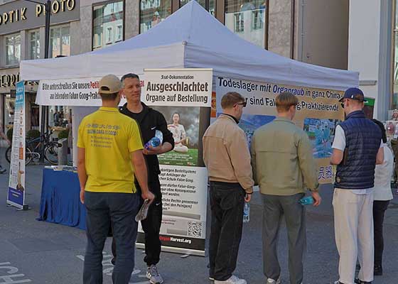 从二月到七月,每逢周六,来自德国和瑞士的法轮功学员在康斯坦茨渡船码头和市中心马克特广场先后设立展位,揭露中共对法轮功的迫害。
