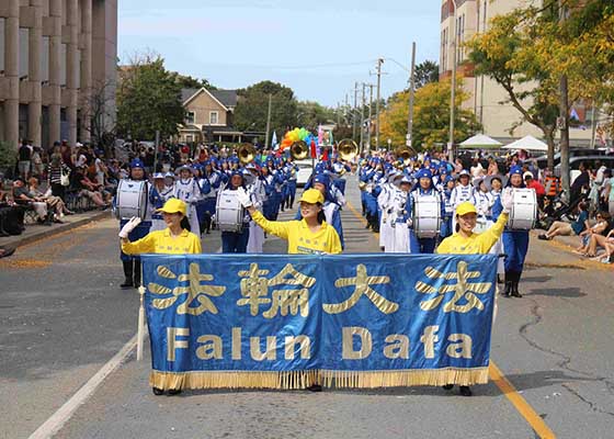 二零二五年九月二十七日,第七十四届葡萄酒节游行在圣·卡瑟琳市盛大举行。由法轮功学员组成的天国乐团和腰鼓队再次受邀参加游行。